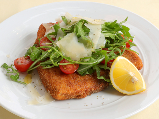 (Swordfish cutlet with rocket salad, cherry tomato and Parmesan cheese)